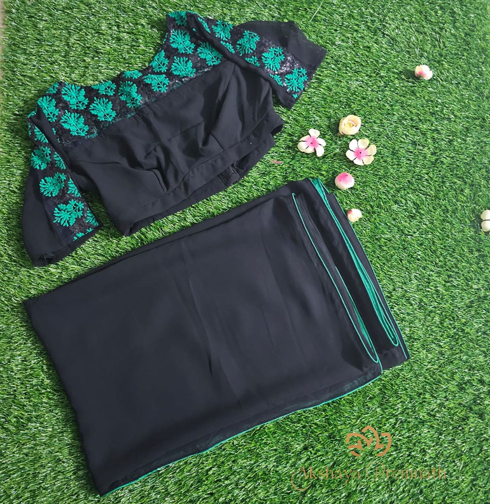 Black georgette saree with teal green border. Boat neck readymade blouse is atta